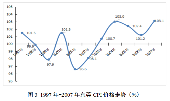 1997年,东莞市CPI小幅上涨1.5%,1998年、1999年受亚洲金融危机影响,分别下降0.1%和2.1%。1999年东莞市建立了一套完整的价格监测体系,市场秩序更为完善,至2000年东莞CPI止跌回升,较上年上涨1.5%;但由于受经济结构调整影响,有效需求不足,2001年-2002年CPI再次走低,分别下降3.4%和1.9%。2003年经济回暖,东莞CPI略涨0.7%,2004年CPI随着经济发展在上行通道运行,上涨3%,之后涨幅逐年收窄,2005年-2006年分别上涨2.4、1.2个百分点,受结构性价格上涨因素影响,2007年上涨3.1%。