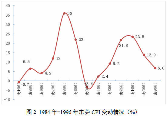 1984年-1996年,东莞物价经历了两次价格高位攀升,CPI走势起伏波动大,累计上涨了154.2%,年均上涨11.9%。第一波大幅上涨出现在1987年-1989年,年涨幅均超过10%。1988年,中共中央决定广东为综合改革试验区,东莞市放开大部分商品的价格,物价飞涨,CPI大幅飙升36%;当年底,为了抑制高涨的物价,国家开始整顿经济秩序、治理经济环境,宏观调控实行“硬着陆”、“急刹车”,削减基本建设投资,大幅提高银行存款利率,1989年CPI涨幅收窄,上涨22%;1990年-1991年飞涨的物价得到抑制,CPI指数出现明显回落。