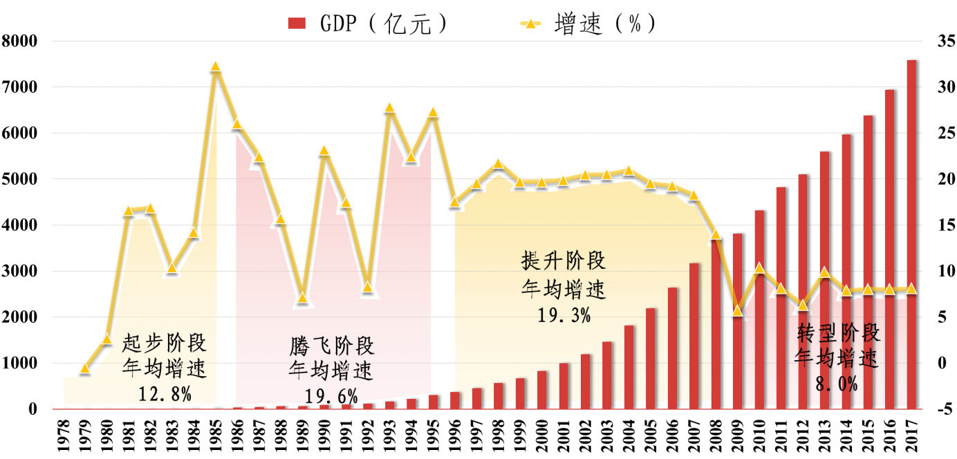 改革开放40年,是东莞经济总量稳步提速、经济实力不断增强的40年。1978年,东莞仍是一个四季飘香的农业县,全市有户籍人口111.23万人。此时,东莞的工业基础十分薄弱,只有一些传统的五金机械、烟花炮竹、草织、腊肠等加工厂,地区生产总值仅有6.11亿元,财政收入只有0.66亿元。然而,在近40年后的今天,东莞的常住人口834.25万人,是1990年的4.8倍,年均增长5.9%;户籍人口211.31万人,是1978年的1.9倍,年均增长2.2%。经济实力实现了大跨越,经济总量突破7000亿元大关,达到7582.12亿元,是1978年的276.3倍,年均增长15.5%,位居全国大中城市第19位。东莞迅速从全国2000多个农业县中脱颖而出,实现了农村工业化和城乡一体化,跻身于全国综合经济实力百强城市。