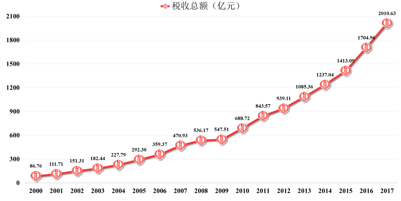东莞实现税收总额突破2000亿元,成为全国第二个国税收入超千亿地级市。2017年,全市税收总额2010.63亿元,总量是2000年的23.2倍,年均增长20.3%,总额排全省第3位,仅次于深圳和广州;税收总额占GDP比重为26.5%,所占比重排全省第3位,仅次于深圳和珠海。