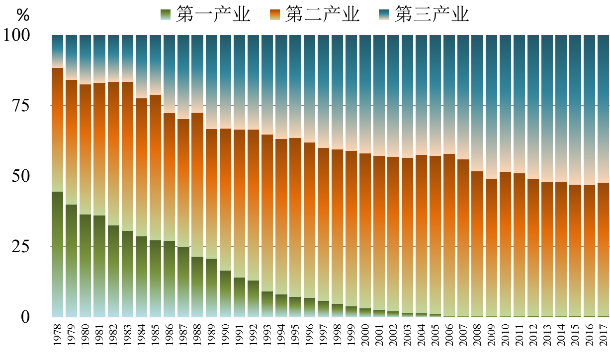 改革开放40年,是东莞经济产业结构发生深刻变革的40年。产业结构明显优化,所有制结构从单一向多元化发展。由以第一产业为主的传统模式向以第三产业为主、二三产业协调发展的模式转变,建立起适应现代社会生产力发展的产业结构体系。1978年三大产业的比例为44.6:43.8:11.6,2017年三大产业的比例为0.3:47.4:52.3,服务业占比超过“半壁江山”,成为我市第一大产业,东莞经济迈入现代产业门槛。东莞商贸、住宿餐饮、交通运输等生产性服务业不断壮大,现代金融、文化创意、会展经济等新兴服务业竞相发展,逐步形成了以金融业、房地产业、信息服务业、科技服务业等现代服务业为主的发展模式,服务业结构进一步优化。2017年现代服务业占第三产业比重达60.6%,现代服务业带动效应明显。