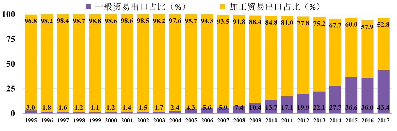 图9 东莞一般贸易和加工贸易出口占比走势图