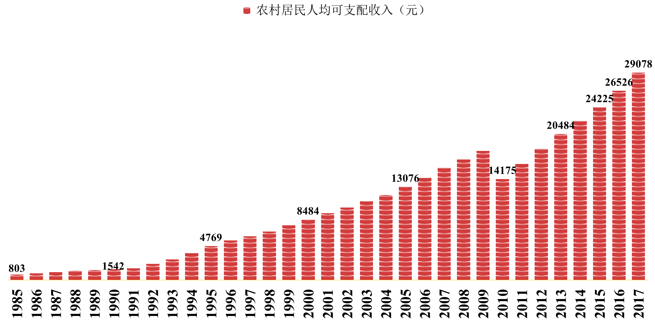 农民收入不断增加,城乡收入差距进一步缩小。2017年东莞农村常住居民人均可支配收入29078元,比1985年增长36.2倍,年均增长11.9%。改革开放以来,农民收入结构变化明显,以农业收入为主的单一结构已成为历史,收入多元化格局逐步形成,2017年农村常住居民人均可支配收入中,工资性收入占86.2%;经营净收入占7.9%;财产净收入占8.6%。农村居民收入的快速增加,生活质量随之提高,消费结构不断优化,2017年农村常住居民人均消费性支出中,食品烟酒消费支出占37.4%;衣着消费支出占5.3%;居住支出占14.7%;生活用品及服务支出占5.1%;医疗保健支出占4.3%;交通通信支出占19.6%;教育文化娱乐服务支出占12.0%。