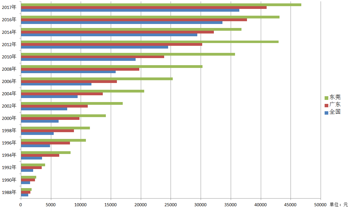 1988年东莞城镇居民人均可支配收入1778元,比全省平均水平高195元,比全国平均水平高597元。1988-2017年,东莞城镇居民收入持续高于全省全国平均水平。