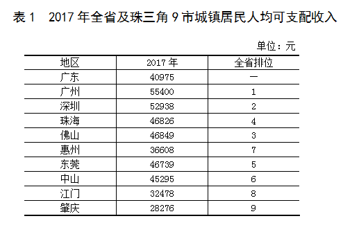 2017年,东莞城镇居民人均可支配收入46739元,比全省平均水平高5764元,比全国平均水平高10343元。在珠三角9个城市当中,东莞排第5位,佛山、珠海和东莞城镇居民人均可支配收入相差不大,3市都在4.6-4.7万元之间。