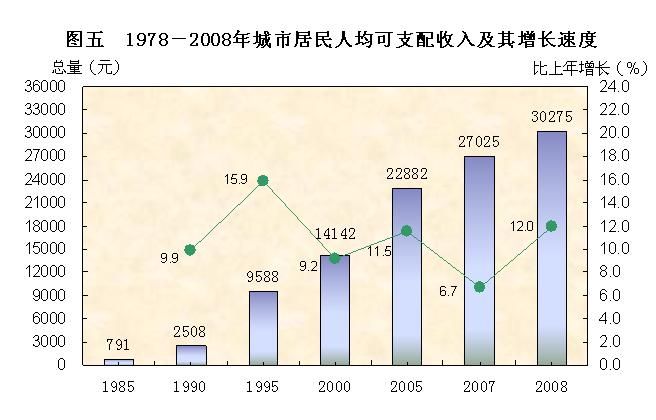 环境整治继续深化,推进机动车排气污染整治。全年整治车辆34091辆,整治超标车辆1259辆,排气合格率由上年的84.4%上升到91.2%。主要污染物得到有力控制和削减。初步核算,全年全市二氧化硫比上年净减排4.58万吨,化学需氧量比上年净减排2.21万吨。开展市级环境友好企业评价工作,40家企业通过“东莞市环境友好企业”审核,健全环境信用管理制度,评价范围扩大到545家企业,并实行动态管理,评定绿牌企业324家、黄牌企业161家、红牌企业60家。 五、人民生活 人口 年末全市户籍人口174.87万人。全年出生人口1.84万人,出生率为10.77‰;死亡人口7752人,死亡率为4.54‰;人口自然增长率为6.23‰。年末全市常住人口694.98万人。人口城镇化率为86.39%。 就业 全年接收大中专毕业生1.50万人。全年人才市场求职登记人数197.01万人,比上年增长20%;成功应聘人数85.97万人,下降14.1%。年末城镇实有登记失业人数7630人,全年失业人员安置就业人数7515人,城镇登记失业率为1.64%。 居民收入 初步预计,2008年全市职工年平均工资13523元,比上年增长9.3%。其中,城镇在岗职工年平均工资39516元,增长12.0%。初步统计,城市居民人均可支配收入30275元,农村居民人均纯收入12328元,分别比上年增长12.0%和6.2%,扣除价格因素,实际增长6.2%和5.6%。城镇最高10%收入组人均可支配收入66034元,城镇最低10%收入组人均可支配收入11172元。 居民消费 全年城市居民人均消费性支出23208元,比上年增长7.7%。其中食品消费支出7778元,增长11.7%;衣着消费支出1349元,增长11.2%;居住消费支出2585元,增长35.8%;家庭设备用品及服务支出1539元,增长14.7%;医疗保健支出1332元,增长54.9%;交通和通信支出4461元,下降14.3%;教育文化娱乐服务支出3464元,下降1.4%;其他商品和服务支出699元,增长29.9%。城市居民家庭恩格尔系数为33.5%。在农民生活消费现金支出中,食品消费支出占35.1%,衣着消费支出占6.4%,居住消费支出占13.8%,家庭设备用品及服务支出占5.7%,医疗保健支出占5.0%,交通通讯支出占16.5%,文教娱乐用品及服务支出占11.0%,其他商品和服务消费支出占6.5%。 表三:2008年居民收支情况 指 标 收入或支出额(元) 比上年增长(%) 城市居民人均可支配收入 30275 12.0 #工资性收入 20872 10.3 财产性收入 3527 -27.3 转移性收入 3047 45.1 城市居民人均消费性支出 23028 7.7 食品 7778 11.7 衣着 1349 11.2 居住 2585 35.8 家庭设备用品及服务 1537 14.7 医疗保健 1332 54.9 交通和通信 4461 -14.3 教育文化娱乐服务 3464 -1.4 其他商品和服务 699 29.9 根据抽样调查资料显示,年末平均每百户城市居民家庭耐用消费品拥有量:家用空调200台,组合音响59套,移动电话248部,家用电脑100台,淋浴热水器127台,家用汽车47辆。年末城市居民人均住房建筑面积