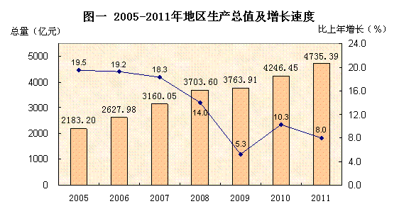 初步核算,2011年东莞生产总值(GDP)4735.39亿元,比上年增长8.0%。分产业看,第一产业增加值17.71亿元,下降0.4%;第二产业增加值2377.40亿元,增长6.8%;第三产业增加值2340.28亿元,增长9.3%。三大产业比例为0.4:50.2:49.4。从经济类型看,公有制经济增加值1171.94亿元,增长4.1%,占全市生产总值的24.7%;民营经济增加值1773.48亿元,增长10.8%,占37.5%;外资经济增加值1789.98亿元,增长7.9%,占37.8%。在第三产业中,交通运输、仓储和邮政业增长14.5%,批发和零售业增长8.0%,住宿和餐饮业增长6.1%,金融业下降0.8%,房地产业增长6.6%,其他服务业增长12.8%。人均地区生产总值57470元,增长5.4%。