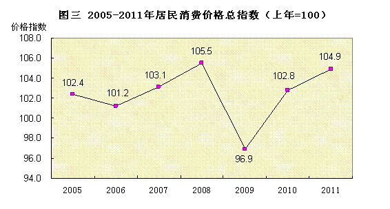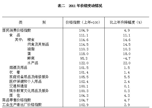 全年居民消费价格总水平上涨4.9%。其中居住类上涨4.3%,娱乐教育文化用品及服务类上涨0.3%,衣着类上涨1.4%,食品类上涨11.1%,医疗保健和个人用品类上涨2.4%,烟酒及用品类上涨1.5%,交通和通信类上涨0.1%,家庭设备用品及维修服务类上涨5.5%。此外,全年商品零售价格上涨4.7%。工业生产者出厂价格上涨2.9%。