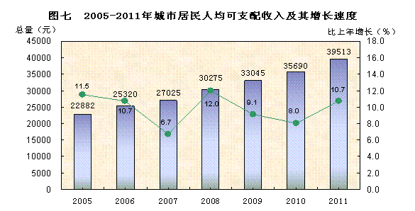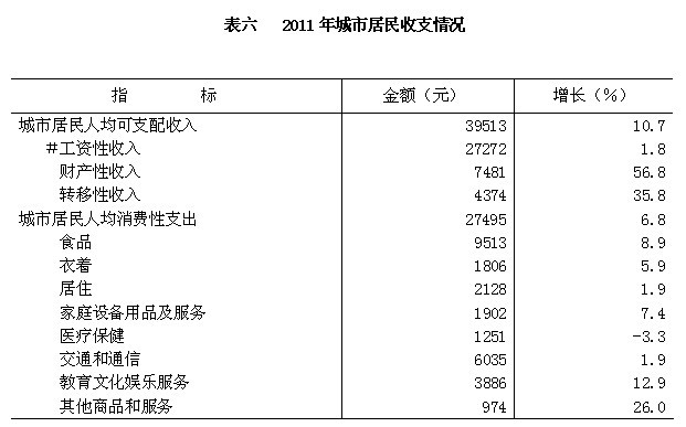 初步统计,2011年全市职工年平均工资21739元,其中,城镇在岗职工年平均工资50398元。城市居民人均可支配收入39513元,农村居民人均纯收入22842元,分别增长10.7%和11.5%。