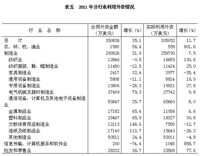 按新口径统计,全年全市新签外商直接投资项目1324宗,合同外资金额35.08亿美元,增长35.1%。实际利用外资30.51亿美元,增长11.7%。其中电子及通信设备制造业实际利用外资6.57亿美元,增长8.0%;专用设备制造业实际利用外资1.99亿美元,增长27.8%。全市新签投资总额超1000万美元项目68宗,增加22宗;新增世界500强企业投资项目5宗,世界500强企业增资4宗;新签第三产业项目合同外资5.25亿美元,占全市的15.0%,比上年提高1.1个百分点。外商进入商贸领域加快。全市新签批发和零售业项目102宗,合同吸收外资2.82亿美元,增长36.7%,占第三产业吸收外资的53.8%。
