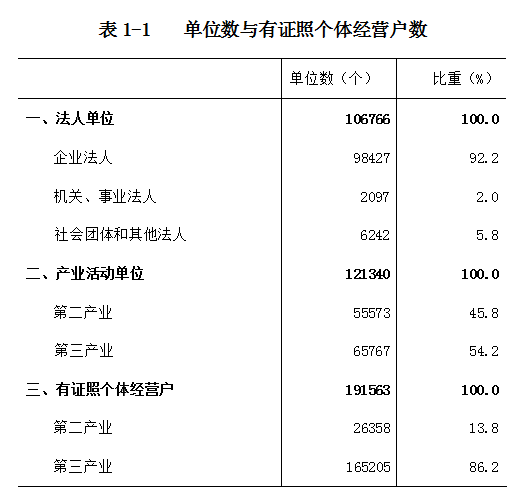 注:表中法人单位合计数含从事农、林、牧、渔服务业和兼营第二、三产业活动的农、林、牧、渔业法人单位44个;有证照个体经营户合计数含从事农、林、牧、渔服务业活动的个体经营户12个。