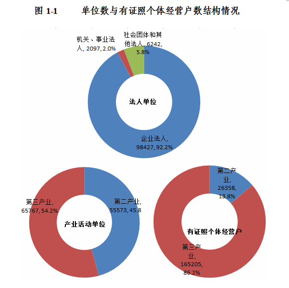 2013年末,全市共有从事第二产业和第三产业活动的法人单位106766个,比2008年末(2008年是第二次全国经济普查年份,下同)增加53964个,增长102.2%;产业活动单位121340个,增加60213个,增长98.5%;有证照个体经营户191563个,增加6404个,增长3.5%(详见表1-1)。