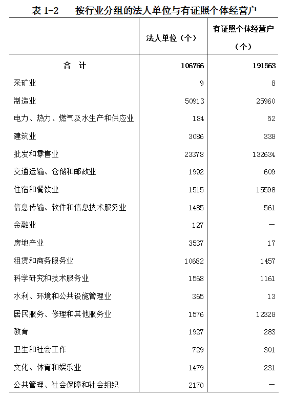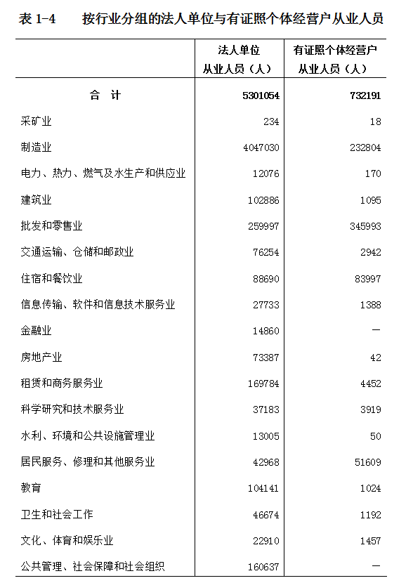 在法人单位从业人员中,位居前三位的行业是:制造业4047030人,占76.3%;批发和零售业259997人,占4.9%;租赁和商务服务业169784人,占3.2%。在有证照个体经营户从业人员中,位居前三位的行业是:批发和零售业345993人,占47.3%;制造业232804人,占31.8%;住宿和餐饮业83997人,占11.5%(详见表1-4)。