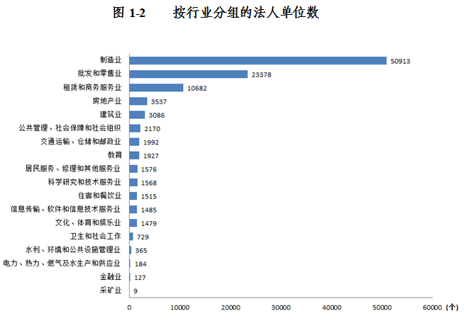 2013年末,在第二产业和第三产业法人单位中,位居前三位的行业是:制造业50913个,占47.7%;批发和零售业23378个,占21.9%;租赁和商务服务业10682个,占10%。在有证照个体经营户中,位居前三位的行业是:批发和零售业132634个,占69.2%;制造业25960个,占13.6%;住宿和餐饮业15598个,占8.1%(详见表1-2)。