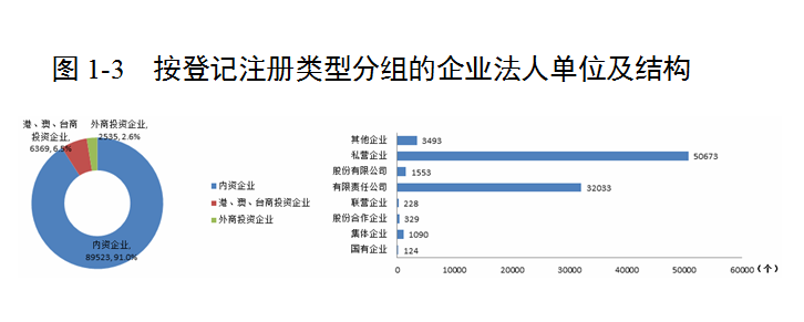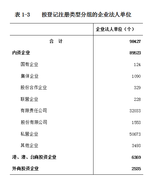 2013年末,全市共有第二产业和第三产业的企业法人单位98427个,比2008年末增加50078个,增长103.6%。其中,内资企业占90.9%;港、澳、台商投资企业占6.5%;外商投资企业占2.6%。内资企业中,有限责任公司占全部企业法人单位的32.5%;私营企业占51.5%(详见表1-3)。