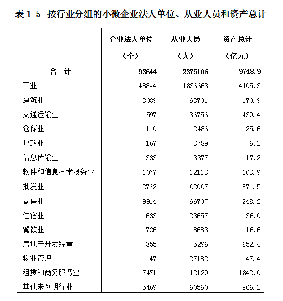 小微企业从业人员2375106人,占全部企业法人单位从业人员31.6%。其中,位居前三位的行业是:工业1836663人,占全部企业法人单位从业人员37.1%;租赁和商务服务业112129人,占2.3%;批发业102007人,占2.1%。