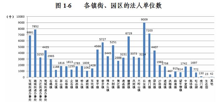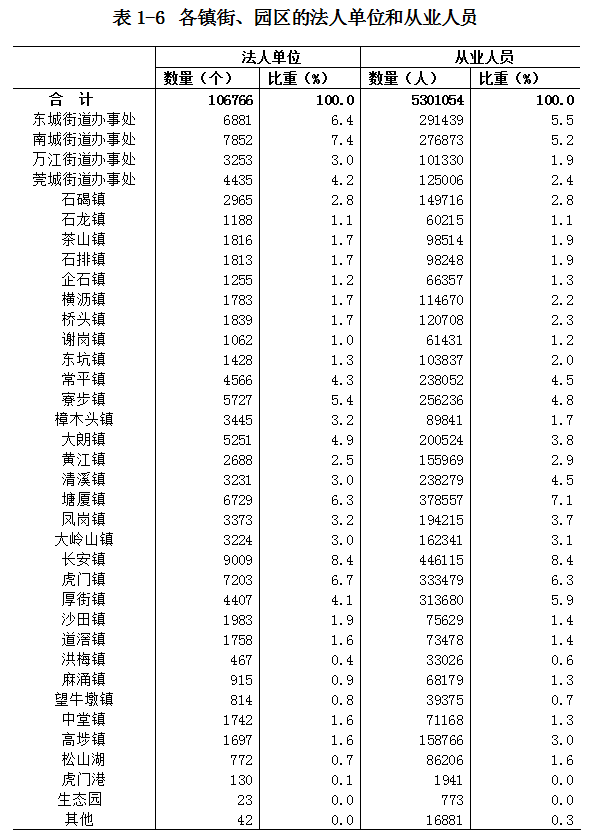 在法人单位中,位居前五位的镇街是:长安镇占8.4%;南城街道办事处占7.4%;虎门镇占6.7%;东城街道办事处占6.4%;塘厦镇占6.3%(详见表1-6)。