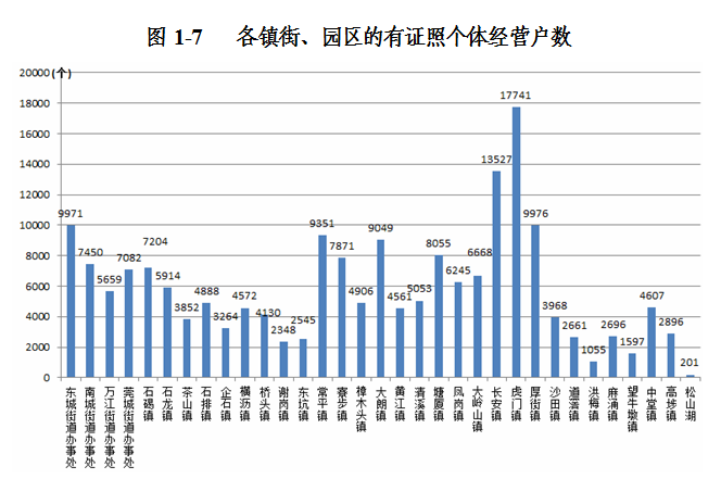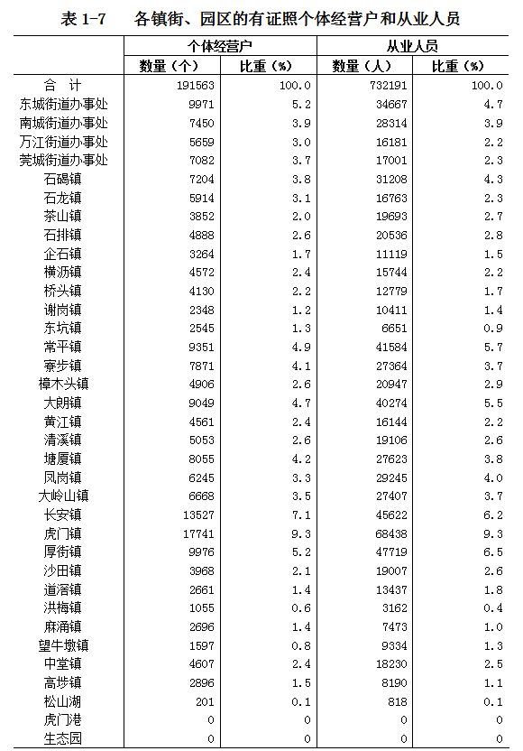 在有证照个体经营户中,位居前五位的镇街是:虎门镇占9.3%;长安镇占7.1%;厚街镇占5.2%;东城街道办事处占5.2%;常平镇占4.9%(详见表1-7)。