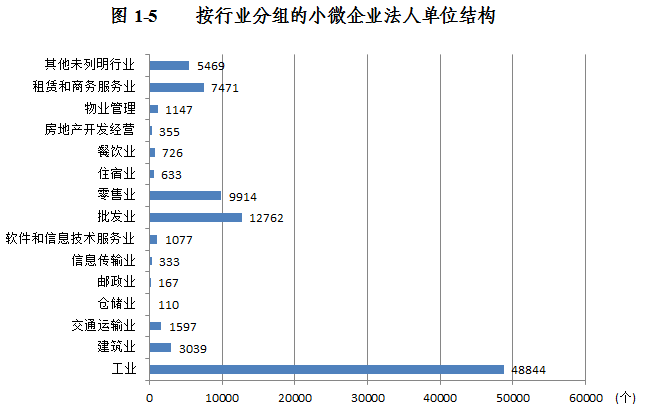 小微企业法人单位资产总计9748.9亿元,占全部企业法人单位资产总计48%。其中,位居前三位的行业是:工业4105.3亿元,占全部企业法人单位资产总计13.3%;租赁和商务服务业 1842亿元,占6%;批发业871.5亿元,占2.8%(详见表1-5)。