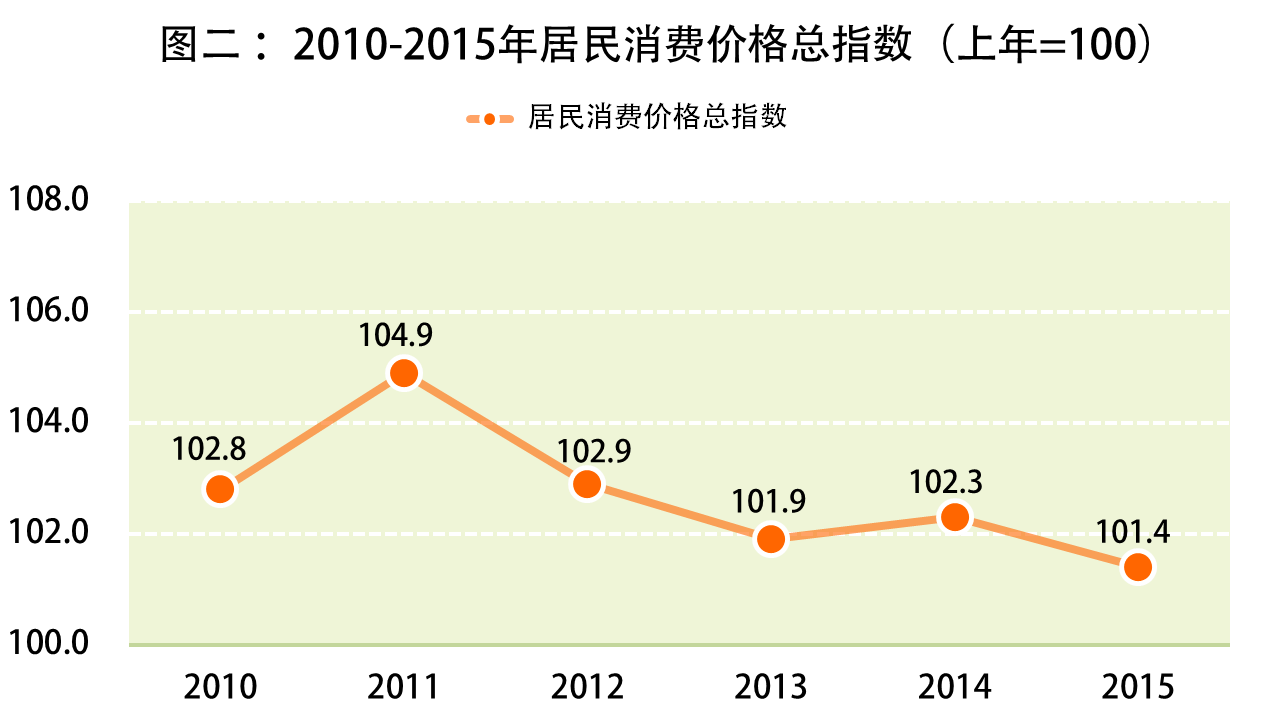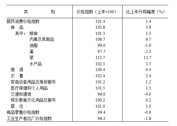 全年居民消费价格总水平比上年上涨1.4%。其中食品类上涨3.8%,烟酒类上涨0.4%,衣着类上涨2.4%,家庭设备用品及维修服务类上涨1.2%,医疗保健和个人用品类上涨1.5%,交通和通信类下降4.0%,娱乐教育文化用品及服务类上涨0.2%,居住类上涨1.0%。此外,全年商品零售价格下降0.6%。工业生产者出厂价格下降1.8%。