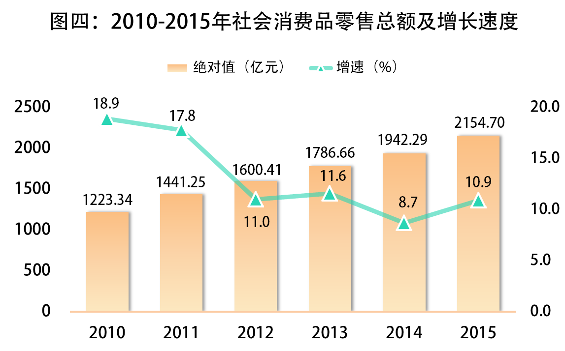 全年社会消费品零售总额2154.70亿元,比上年增长10.9%。分行业看,批发零售贸易业零售额2003.10亿元,增长11.1%;住宿餐饮业零售额151.60亿元,增长8.5%。