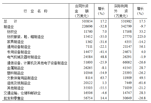全年全市新签外商直接投资项目440宗,合同外资金额50.59亿美元,增长17.2%。实际利用外资53.20亿美元,增长17.5%。其中通信设备、计算机及其他电子设备制造业实际利用外资6.61亿美元,下降26.6%;专用设备制造业实际利用外资2.47亿美元,增长4.0%。