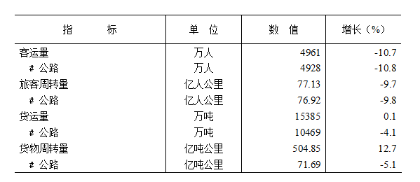 全年公路货物运输量10469万吨,货物周转量71.69亿吨公里;水路货物运输量4916万吨,货物周转量433.16亿吨公里。全年公路运输完成客运量4928万人,旅客周转量76.92亿人公里;水路运输完成客运量33万人,旅客周转量2148万人公里。全年港口旅客吞吐量32.42万人次,货物吞吐量13149万吨。