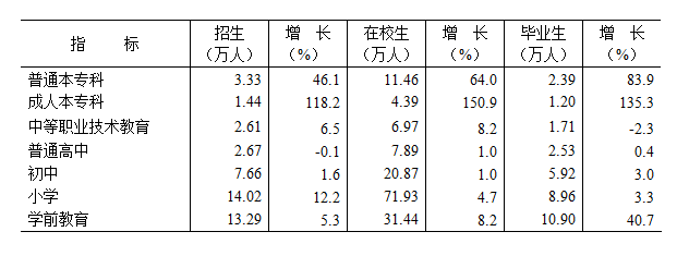 年末,全市有幼儿园949所,同比增加68所,其中,省、市一级幼儿园450 所,比上年增加174 所。全市有小学327所,在校学生71.93万人,本市户籍学龄儿童入学率达100%,小学毕业生升学率达100%。全市有初中179 所(不含完全中学),在校学生20.87万人,本市户籍适龄少年初中入学率100%,初中毕业生升学率98.5%。全市高中阶段学校共有61所,其中普通高中(含完中和多层次学校高中部)39所,在校生7.89万人,中职学校25所(含技工学校3所),在校生6.97万人。全市有普通高等院校8所,在校学生11.46万人。全年普通高等院校共招收本科、专科学生3.33万人,毕业生2.39万人。