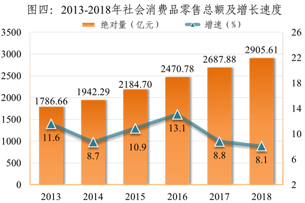 全年社会消费品零售总额2905.61亿元,比上年增长8.1%。分地域看,城镇消费品零售总额2478.57亿元,增长4.9%;乡村消费品零售总额427.04亿元,增长31.6%。分消费形态看,商品零售额2721.85亿元,增长8.2%;餐费收入183.76亿元,增长7.2%。分行业看,批发零售贸易业零售额2715.44亿元,增长8.1%;住宿餐饮业零售额190.18亿元,增长7.5%。