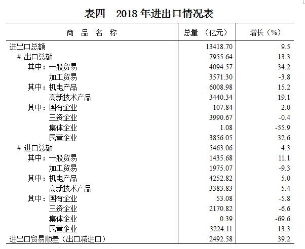 全年全市进出口总额13418.70亿元,比上年增长9.5%。其中进口5463.06亿元,增长4.3%;出口7955.64亿元,增长13.3%。“一带一路”沿线国家进出口额2632.89亿元,增长25.4%。全市电子商务交易额4801亿元,增长14.3%。
