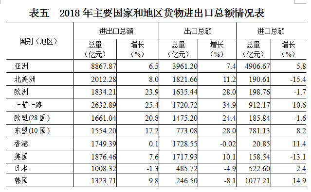 按出口的地区分,对亚洲出口3961.20亿元,比上年增长7.4%;对北美洲出口1821.66亿元,增长11.2%;对欧洲出口1635.44亿元,增长28.0%;对拉丁美洲出口325.86亿元,增长32.7%;对大洋洲出口111.41亿元,增长21.0%。