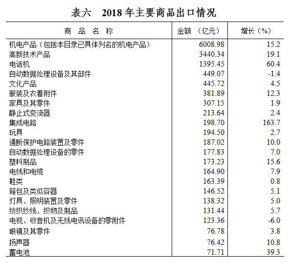 全年机电产品出口6008.98亿元,比上年增长15.2%,占出口总额的75.5%;高新技术产品出口3440.34亿元,增长19.1%,占出口总额的43.2%。