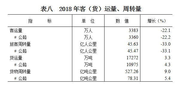 全年公路货物运输量10975万吨,货物周转量78.31亿吨公里;水路货物运输量6298万吨,货物周转量448.95亿吨公里。全年公路运输完成客运量3360万人,旅客周转量45.47亿人公里;水路运输完成客运量23.78万人,旅客周转量1546万人公里。全年港口旅客吞吐量21.71万人次,货物吞吐量16417.13万吨。