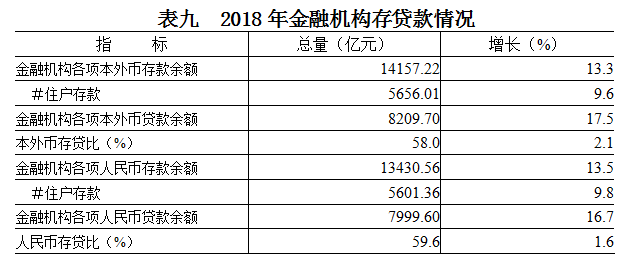 年末金融机构各项本外币存款余额14157.22亿元,比上年增长13.3%。其中住户存款余额5656.01亿元,增长9.6%。各项本外币贷款余额8209.70亿元,增长17.5%。在个人消费贷款余额中,个人住房按揭贷款余额3046.26亿元,增长13.3%;个人汽车消费贷款余额8.23亿元,增长407.9%。