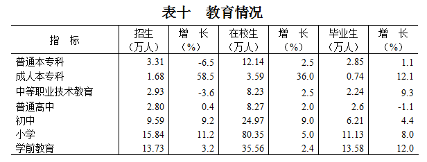 年末全市幼儿园1125所,比上年末增加48所;其中省、市一级幼儿园540所,增加20所。全市小学328所,在校学生80.35万人;本市户籍小学学龄儿童入学率达100%,小学毕业生升学率达100%。全市初中198所(不含完全中学),在校学生24.97万人;本市户籍适龄少年初中入学率100%,初中毕业生升学率98.41%。全市普通高中42所,在校生8.27万人;中职学校28所(含技工学校7所),在校生8.23万人。全市普通高等院校9所,在校学生12.14万人;全年普通高等院校共招收本科、专科学生3.31万人,毕业生2.85万人。