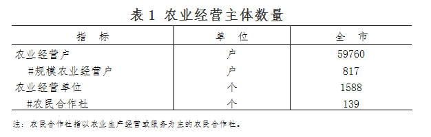 2016年,我市农业经营户59760户,其中规模农业经营户817户。我市农业经营单位1588个,其中农业普查登记的以农业生产经营或服务为主的农民合作社139个。