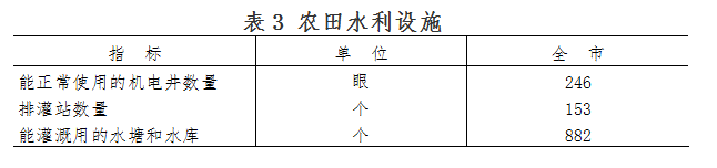2016年末,我市调查村中能够正常使用的机电井数量246眼,排灌站数量153个,能够使用的灌溉用水塘和水库数量882个。