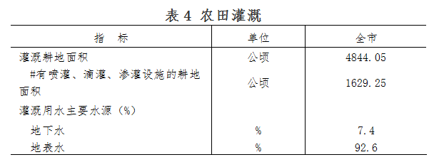 2016年末,我市灌溉耕地面积4844.05公顷,其中有喷灌、滴灌、渗灌设施的耕地面积1629.25公顷;灌溉用水主要水源中,使用地下水的户和农业生产单位占7.4%,使用地表水的户和农业生产单位占92.6%。