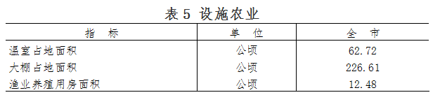 2016年末,我市温室占地面积62.72公顷,大棚占地面积226.61公顷,渔业养殖用房面积12.48公顷。