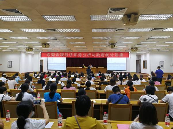梁佳沂局长通过大量的数据图表和生动鲜活的案例,深刻分析了当前国内外宏观经济形势,详细讲解东莞经济发展史,分享近年来东莞市局在统计工作改革创新等方面的工作。